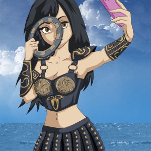 Belle illustration de l’héroïne des Chroniques de Liber, Mégumi Valone, en tenue d’Eve, se prend en selfie avec le challenge one finger. Son fond rose pastel la rend compatible avec n’importe quel support. Ce poster est la base parfaite pour une décoration geek et fun.